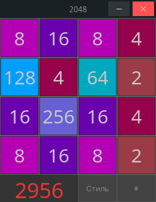 Необходимо стрелками сдвигать все плитки с числами вправо или влево или вверх или вниз, при этом одинаковые числа складываются. Задача набрать как можно больше плиток с большими числами, их сумма является числом очков за игру (сейчас). Конец игры когда поле заполнено плитками и невозможно сложить, чтобы добавить новую.